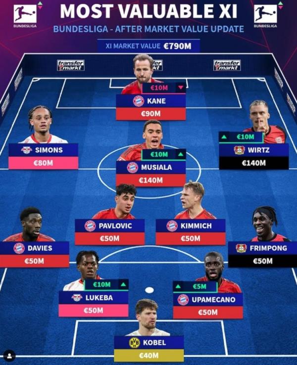 德轉列德甲最貴陣:穆西亞拉領(lǐng)銜拜仁6將,維爾茨、西蒙斯在列